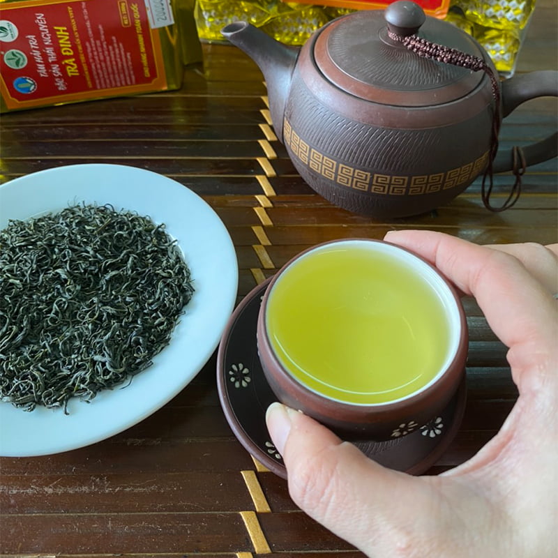 Sản phẩm Trà tôm thượng hạng hay trà đinh nõn thu hái từ những búp chè tươi 1 tôm 1 lá rất nhỏ thượng hạng theo tiêu chuẩn Vietgap từ những cây trà lâu năm, trà có hương thơm mùi cốm nếp mới, hương thơm của tự nhiên màu ước trà sánh xanh có màu vàng sáng vị trà chát nơi đầu lưỡi đến liền sau đó là vị hậu ngọt đậm đà thấm sâu nơi cổ họng.